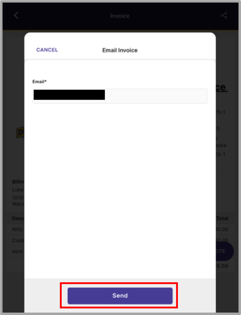 (1- Optional) From the Invoice Page, the user may click the ‘Send Invoice’ button to bring up the option to send the invoice to the customer’s email address. (2- Optional) If/when the user is ready to send the invoice, they will click ‘Send’ and the customer should receive the invoice notification through their configured communication method (Email/Text).
