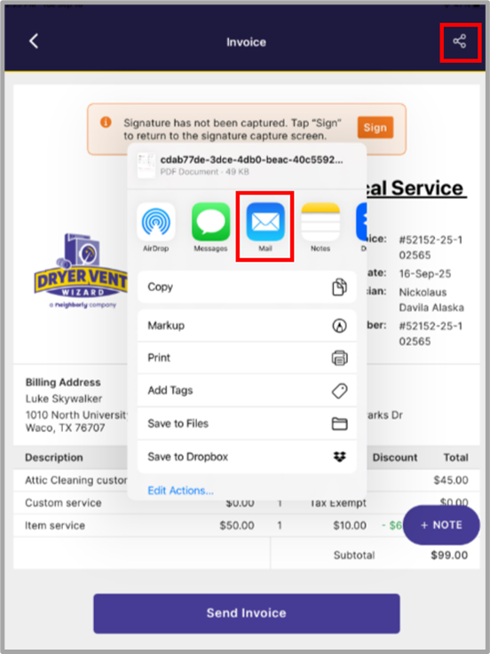 Please Note: If a Service Pro is attempting to send the invoice PDF to the customer outside of Onverity, they will not need to click ‘Send Invoice’ option to initiate the selected app.