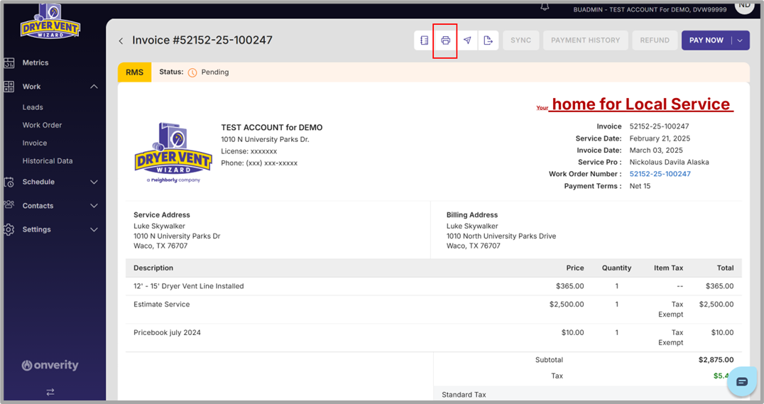 (1- Optional) On the invoice page, the user may click the ‘Print’ icon to print the invoice from Onverity.